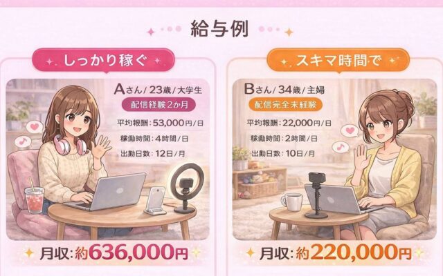 1配信¥100,000以上 月間¥1,000,000以上のキャストを複数名、輩出しています。プロフィール作成/キャラクター設定/円滑なコミュニケーション方法/カメラアングル 等